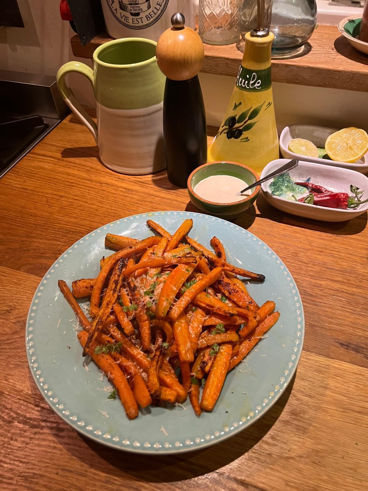 Lekkere wortelfrietjes met parmezaanse kaas.